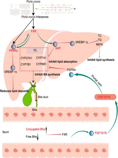 非酒精性脂肪肝病(NAFLD),亦称代谢功能障碍相关脂肪肝病(MAFLD),是全球范围内发病率最高的肝脏疾病,与肥胖、高血压、脂质代谢异常及Ⅱ型糖尿病等代谢紊乱状况紧密相关。NAFLD的典型特征是肝脏内脂质过度沉积,即脂肪变性,这一过程可能逐步演进为非酒精性脂肪肝炎(NASH)、肝纤维化、肝硬化乃至肝细胞癌,最终导致肝组织坏死。近期研究指出,茯苓三萜通过调控脂质稳态及胆汁酸代谢中的FXR/PPARα-SREBPs信号通路,有效缓解高脂饮食诱导的NAFLD病情。因此,茯苓三萜展现出作为预防和治疗非酒精性脂肪肝药物或营养补充剂的巨大潜力[1]。